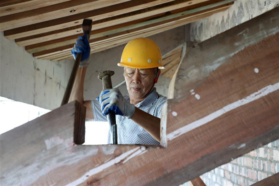 工作人員正在安裝斗栱