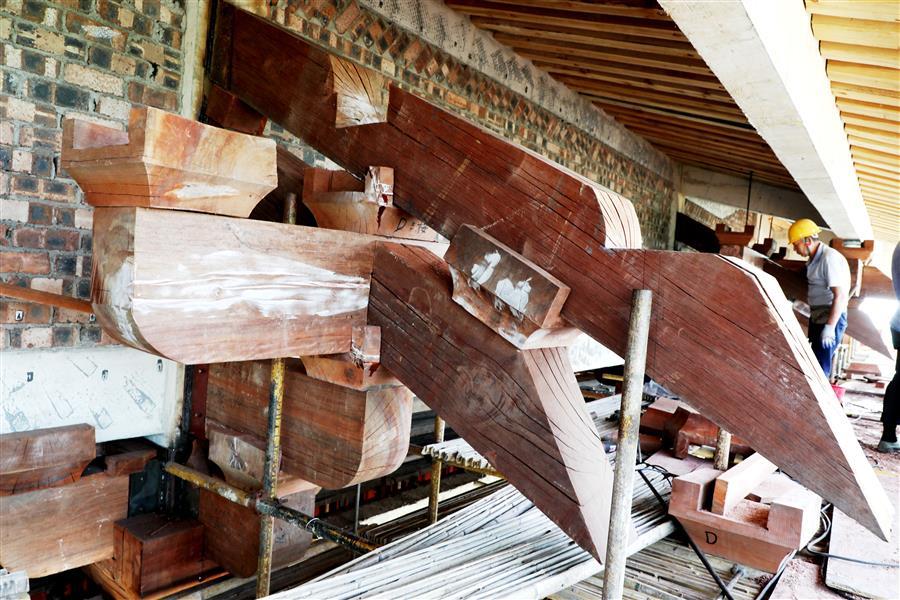 連日來,在該項目湖心閣斗栱安裝現(xiàn)場,每天有20多名經(jīng)驗豐富的木工師傅在認真進行斗栱安裝作業(yè)。為保證項目質量,解決項目斗栱安裝難題,加快安裝速度,項目部結合實際,通過多次試驗和優(yōu)化設計,確保柱子能承受斗栱重量,采用正裝方式進行安裝,保證了安裝速度和安裝質量。面對項目選用的木制斗栱材料密度大、重量重、安裝作業(yè)工作面窄等困難,木工師傅結合自身多年的木工經(jīng)驗,克服現(xiàn)場施工遇到的困難,相互配合,目前已完成斗栱安裝工作量的三分之一。