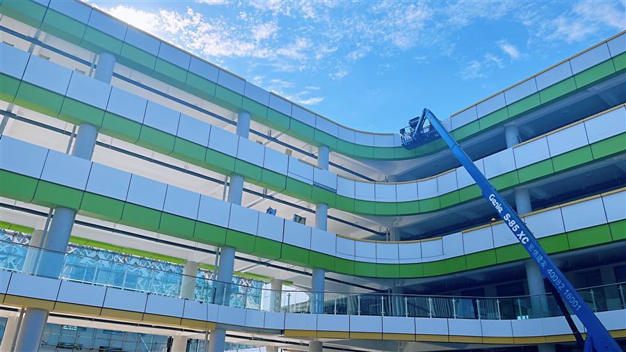經(jīng)過兩個多月的奮戰(zhàn),項目已進入施工收尾階段,并有望提前竣工。當(dāng)前,項目總進度已完成90%以上,小學(xué)和初中部共4棟教學(xué)樓及行政樓內(nèi)裝、智能化設(shè)備安裝、電氣等已全部完成,行政樓一樓報告廳除地板正在安裝外,其他已基本完成,風(fēng)雨操場正在進行外墻鋁隔板安裝,室外兩個運動場及校園內(nèi)場地鋪裝已基本完成。