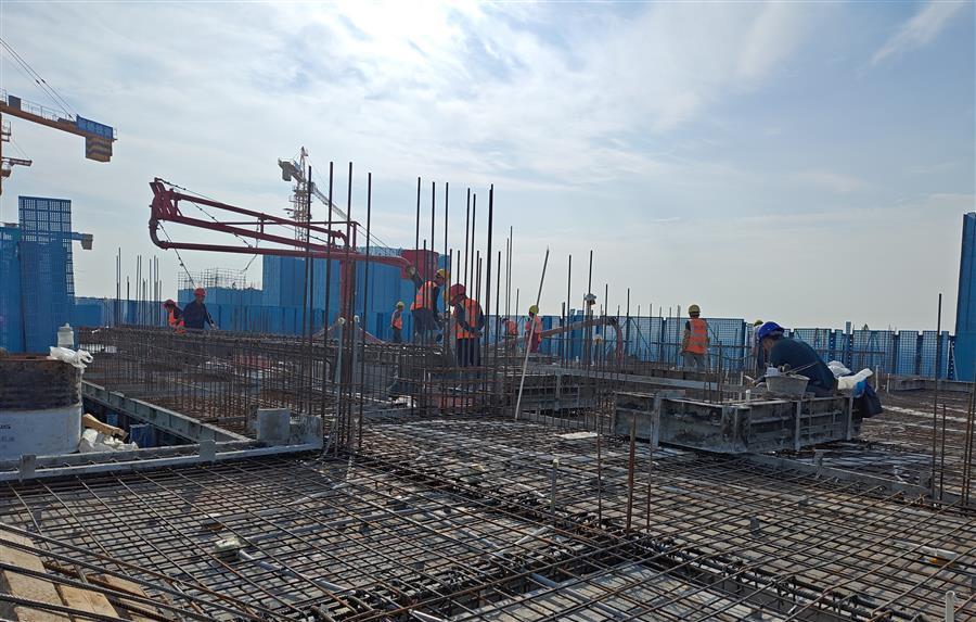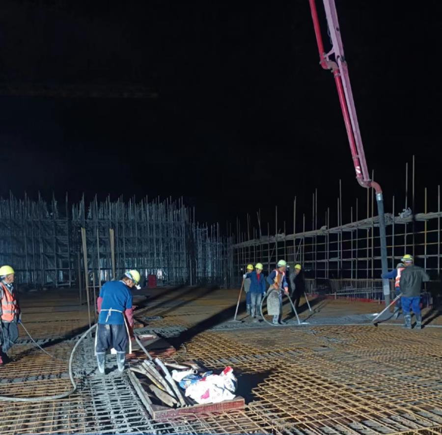 為確保工程快速推進,項目部實行兩班制,科學制定了夜間專項施工方案,倒排工期,規(guī)劃任務單,明確了各施工點的建設內容、時間節(jié)點以及相關責任人,有序推進夜間施工作業(yè)。目前,中試車間一層二次結構砌筑完成;1#、2#生產車間正在搭設49-57軸模架及進行40-45軸剛性地面施工;宿舍樓在進行4層梁板砼澆筑和頂板模板、鋼筋施工;倉庫在進行2層梁板砼澆筑和2層模架搭設。累計完成產值約1.15億元,完成合同造價的23.5%。