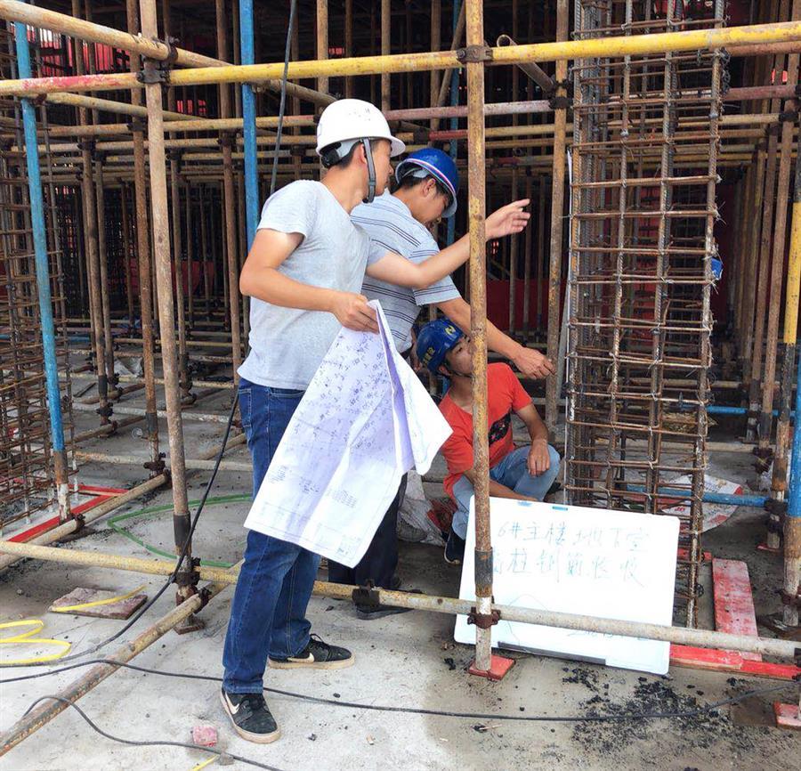 6月18日,在桂華分公司承建的梧州佛子時代廣場項目現(xiàn)場,當(dāng)空烈日讓偌大的工地一片熾熱,焊花飛濺,工程車來來往往,工人們揮汗如雨。雖然施工作業(yè)已經(jīng)避開了高溫時段,但工人們?nèi)员缓顾粤搜劬?,濕了衣服。盡管這樣,大家仍堅持“全副武裝”,手套、防護用具,安全帽,一樣都沒有少,自覺遵守安全文明施工相關(guān)規(guī)范。入行兩年的施工員趙俊財抹了一把汗說道:“剛參加工作時,不能和家人一起過節(jié)還挺難受的,后來把心態(tài)調(diào)整好了,想著只要家人安好,其實比什么都重要,趁著年輕,還是應(yīng)該多奮斗?!笨粗幻装舜髠€的他手拿圖紙和卷尺,蜷縮著身子,蹲在空間有限且熱得發(fā)燙的平臺上仔細(xì)檢查剛剛綁扎好的鋼筋籠,驕陽烤得他黝黑的皮膚泛出一層水光,襯著那還略顯年輕的臉龐,顯得熠熠生輝。