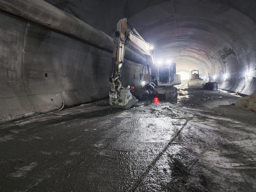 在施工現(xiàn)場,機器轟鳴,挖掘機正在對隧道明洞部分的土方進行開挖,出渣車有序作業(yè)外運渣土;工人們正有條不紊地焊接、搭建地連墻鋼筋籠;在隧道深處,一臺挖掘機在操作人員的操控下,正揮動著“手臂”,配合著工人在對隧道路面做清理。“為加快項目施工進度,我們采取人員倒班、設備不停,白天晚上不間斷施工。”項目經(jīng)理介紹說,目前隧道工程已全面貫通,爭取在春節(jié)前完成仰拱和墻供二襯砼澆筑。