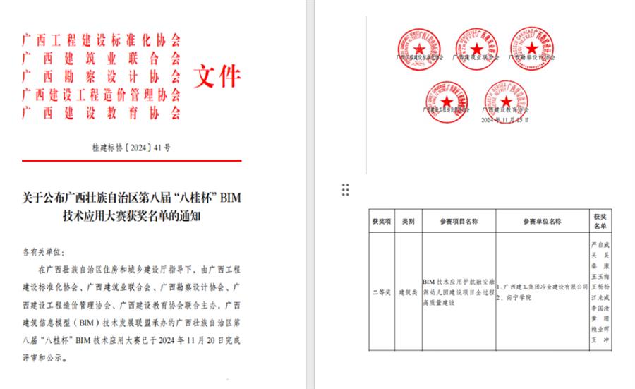 近日,廣西第八屆“八桂杯”BIM技術(shù)應(yīng)用大賽獲獎(jiǎng)名單公布,冶建公司基礎(chǔ)分公司申報(bào)的《BIM 技術(shù)應(yīng)用護(hù)航融安融洲幼兒園建設(shè)項(xiàng)目全過(guò)程高質(zhì)量建設(shè)》榮獲施工組建筑類(lèi)二等獎(jiǎng)。