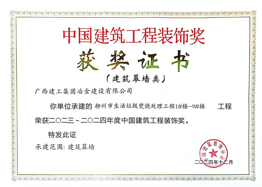 12月10日,中國建筑裝飾協(xié)會(huì)九屆四次理事會(huì)九屆六次常務(wù)理事會(huì)暨中國建筑裝飾協(xié)會(huì)成立40周年大會(huì)在北京召開,冶建公司承建的柳州市生活垃圾焚燒處理工程1#樓-9#樓獲2023—2024年度“中國建筑工程裝飾獎(jiǎng)”。至此,冶建公司已經(jīng)七奪“中國建筑工程裝飾獎(jiǎng)”。