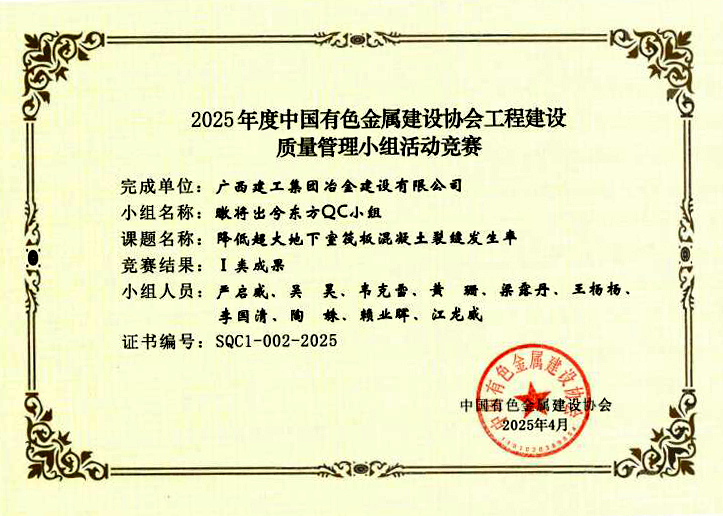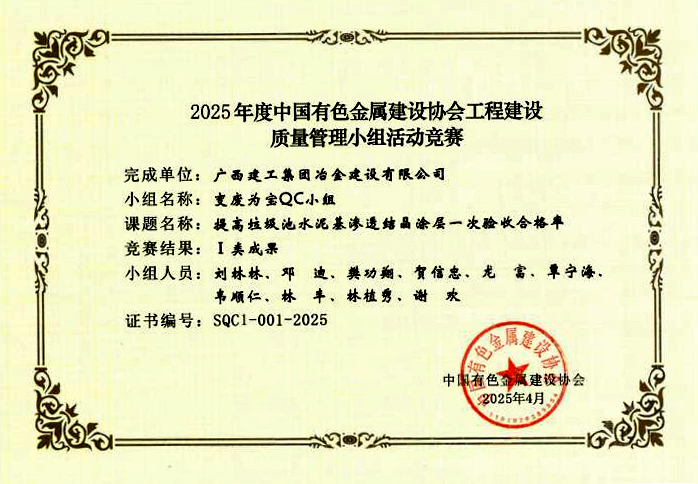 近日,中國有色金屬建設(shè)協(xié)會公布2025年度中國有色金屬協(xié)會工程建設(shè)質(zhì)量管理小組活動競賽結(jié)果,冶建公司申報的4項成果中,有三項獲得Ⅰ類成果,一項獲得Ⅲ類成果。公司此次申報獲獎率100%。