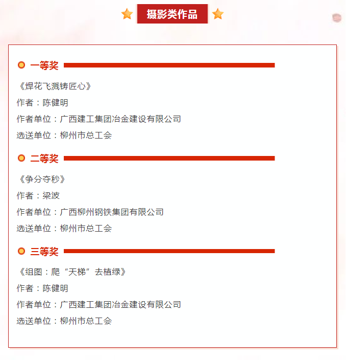據(jù)了解,自活動(dòng)啟動(dòng)以來,全市各級(jí)工會(huì)和廣大職工朋友積極響應(yīng),共報(bào)送各類作品124件,柳州市共有14件優(yōu)秀作品獲獎(jiǎng),其中公司有2件作品獲獎(jiǎng),分別是《焊花飛濺鑄匠心》和《組圖:爬“天梯”去植綠》。